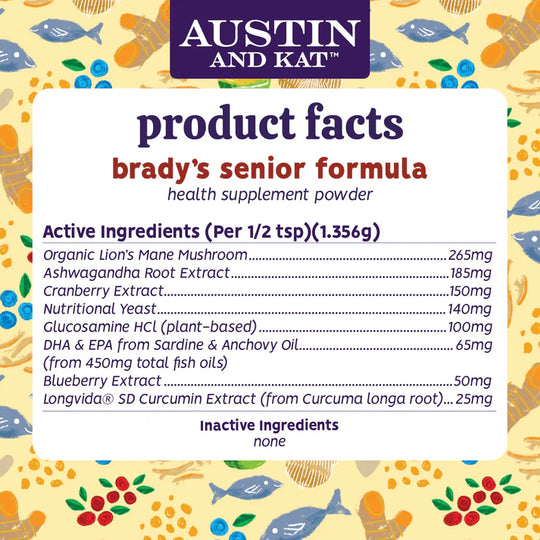 Brady's Senior Support Powder Make age just a number with this natural but powerful formulation. Inspired by Kat’s dog, Brady, to give proven senior support - this handpicked combination of botanicals, adaptogens, lion's mane, and fish...Regular price $29.99 -