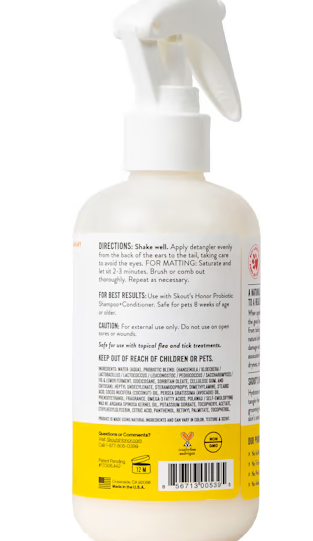 Skout's Honor Probiotic Detangler hydrates the skin and softens the coat for a more brushable, tangle-free pet. It contains avocado oil and topical probiotics that help support a healthy microbiome to defend against common skin problems...Regular price $14.99 -