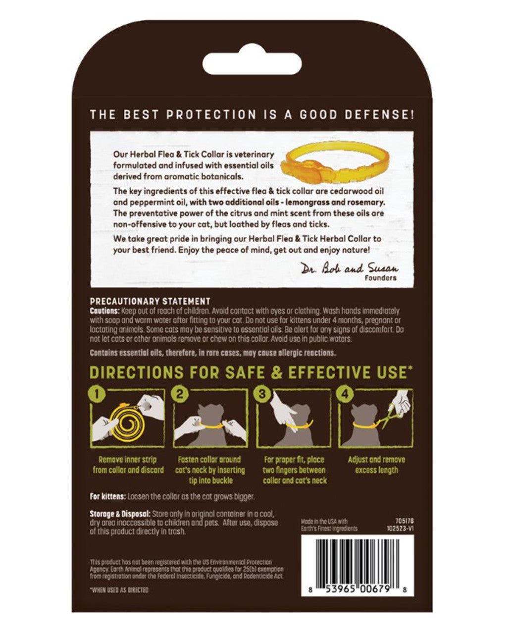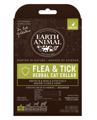 Earth Animal Herbal Flea and Tick Defense Cat Collar Earth is a natural method of protecting your cat. It uses natural powerful herbs and essential oils to gently and effectively protect against fleas and ticks. It has a pleasant scent and can be effective for up to 3 months. This collar works without the use of chemical pesticides. It is veterinary formulated and infused with a blend of aromatic herbs and essential oils with a fresh, minty fragrance. Cedarwood Oil and Peppermint Oil are the key ingredients, and they are both gentle oils that are non-offensive to your cat. Approved and tested by EPA as a safe alternative to harmful pesticide collars.