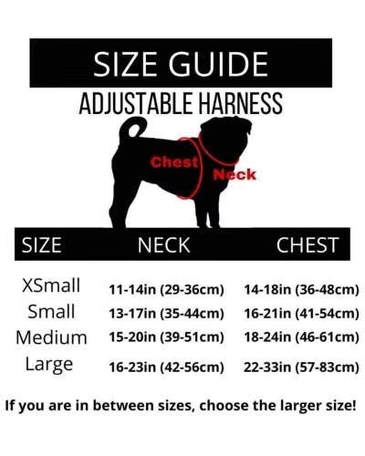 The underside is made of quick-drying mesh material with your pup's comfort in mind.  Available in XS - L sizes. Adjustable straps allow the harness to grow with your pup for maximum use.