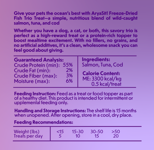 DESCRIPTION Give your pets the ocean’s best with AryaSit! Freeze-Dried Fish Trio Treat—a simple, nutritious blend of wild-caught salmon, tuna, and cod Whether you have a dog, a cat, or both, this savory trio is perfect...Regular price $16.95 -