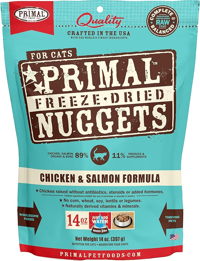 Primal Chicken & Salmon Formula Nuggets Grain-Free Raw Freeze-Dried Cat Food offers your hungry kitty all the benefits of a safe and wholesome raw-food diet—without you having to grind, chop, measure or mix the ingredients yourself! Taking great pride to source only the best ingredients, this tasty and nutritious diet is packed with naturally derived vitamins and minerals. The high-protein ratio appeals to your feline friend’s primal diet, and it’s an excellent way to maintain a proper weight and boost overall health. And best of all, it’s a breeze to serve, thanks to the naturally preserved nuggets—just add water! The proof comes in watching him lick the bowl clean while thriving happily and healthfully.