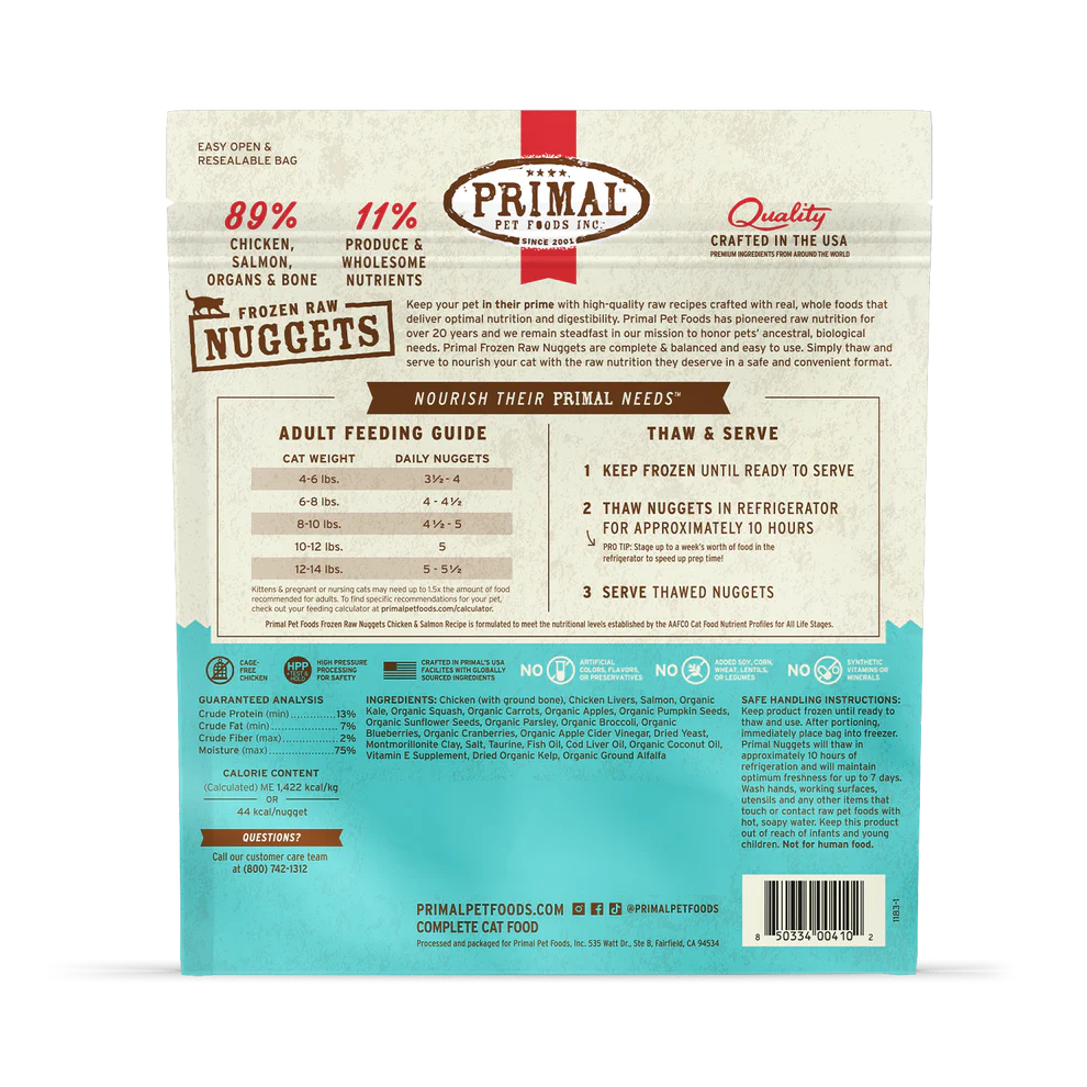 Nourish your cat’s primal needs with complete and balanced, easy-to-use Primal Frozen Raw Nuggets. Our Chicken & Salmon Recipe raw cat food features cage-free chicken raised without antibiotics, steroids, or added hormones and wild-caught salmon. There’s no need to grind, chop, measure, or mix. Simply thaw and serve as a meal or a mixer to keep your cat in their prime. Available in 3-pound resealable bags.