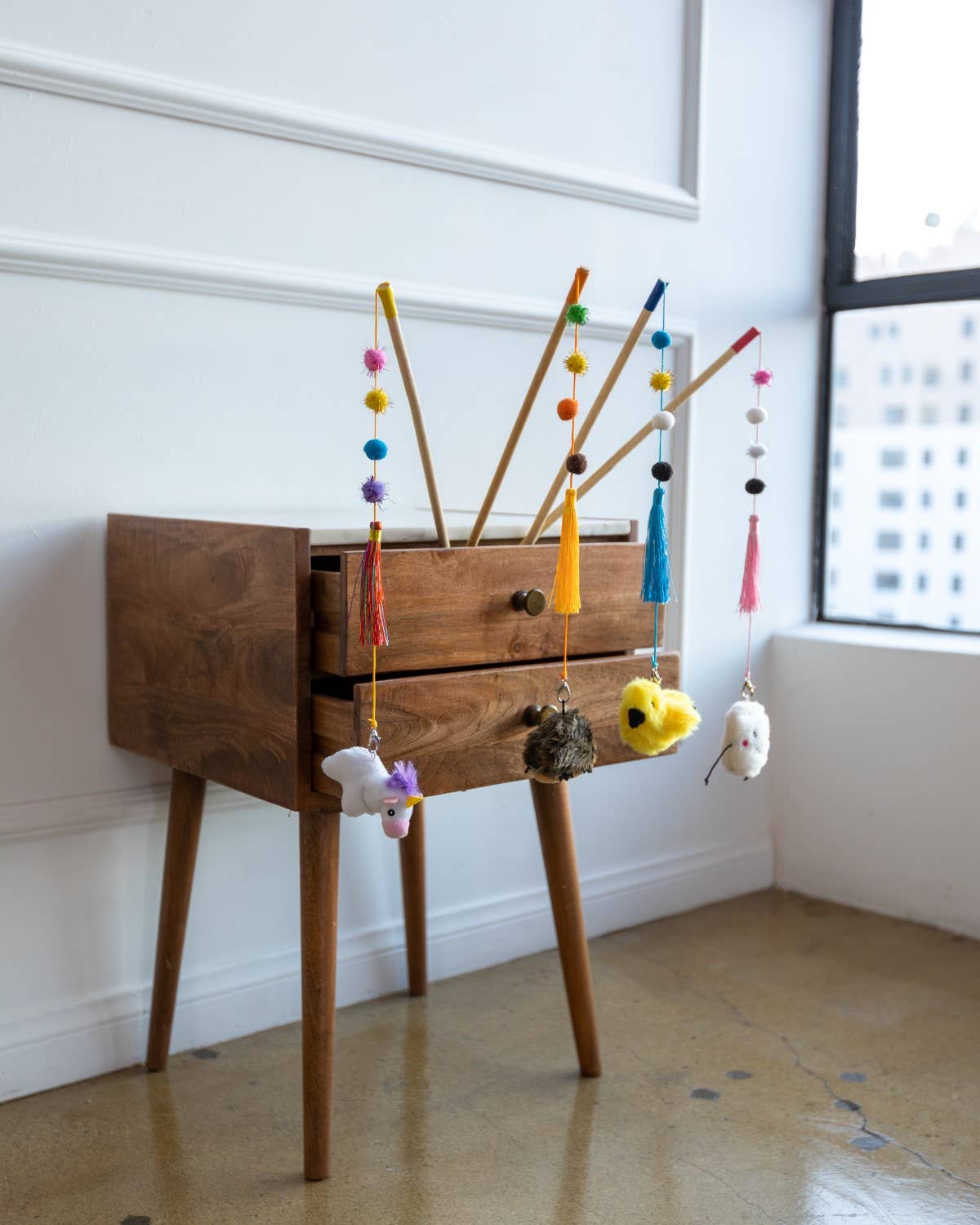 Tease your cat into exciting play with the ZippyClaws™ ZippyStick! Highly interactive, the ZippyStick is a great toy for bonding with your cat while providing them with an outlet for their instinctual hunting behaviors. Each ZippyClaws™ ZippyStick is made of sturdy eco-friendly bamboo and features enticing pompons, tassels, and a detachable Miniz toy that can be switched out with a ZippyClaws™ NomNomz®.