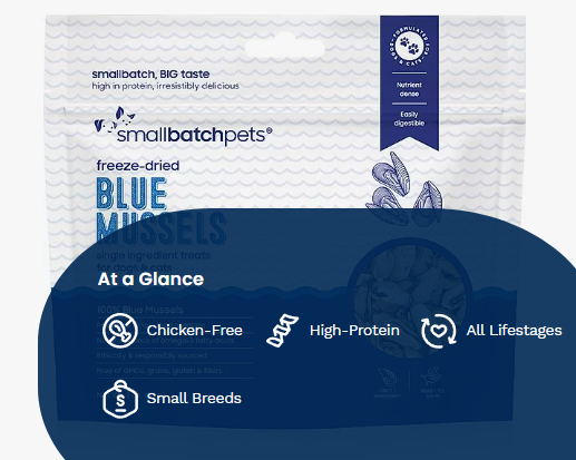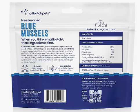 Crafted from 100% sustainably sourced mussels, a Monterey Bay sustainability "Best Choice". High protein, single ingredient treat. Naturally rich in omega-3s, including EPA and DHA, to support healthy skin and coat. Gently freeze-dried to preserve whole...Regular price $16.99 -