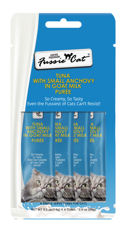 Fussie Cat Premium Tuna with Small Anchovies in Goat Milk Puree Lickable Cat Treats, 2-oz pouch, case of 4
