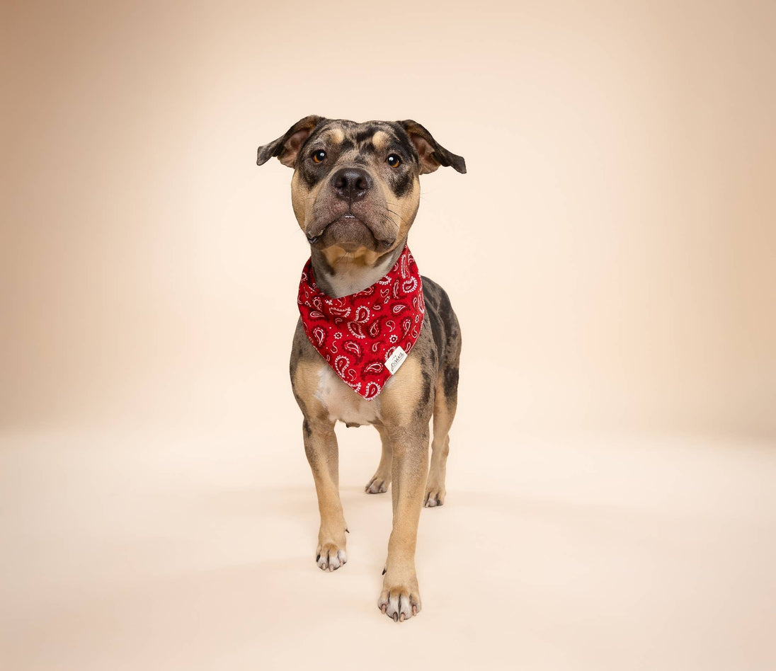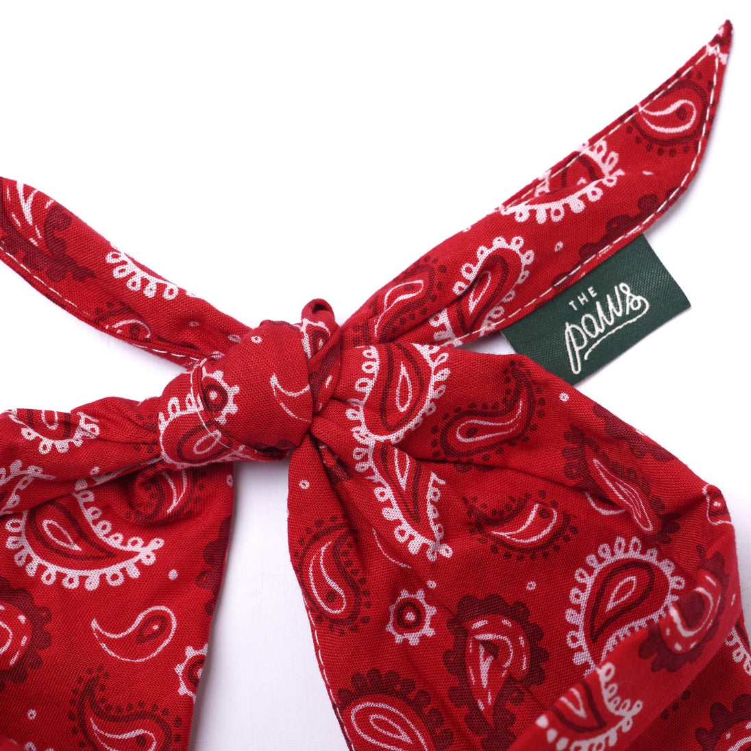 Classic everyday bandana detail - red paisley pattern with teardrop shaped detail Tailor cut double sided dog bandanas