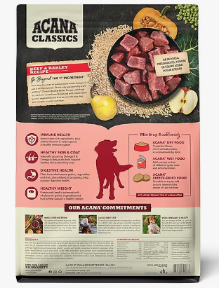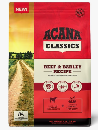 Nurture your furbaby with the simple nutrition and wholesome ingredients in the ACANA Classics Beef & Barley Recipe Dry Dog Food. This recipe is crafted with protein-rich fresh or raw farm-raised beef for paw-some taste. That tasty protein is balanced with wholesome grains, veggies, plus a blend of probiotics. Together, those ingredients support your best friend’s immune, skin and coat, and digestive health. They also help your pup to maintain a healthy weight. This recipe is free of artificial preservatives, colors, and flavors, so you can feel great about choosing it for your pup.