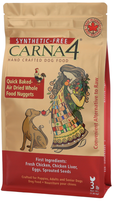 Carna4 Chicken variety is whole food nutrition for all life stages of your dog. Our Canadian-made pet food starts with 100% fresh chicken (we use the muscle & flesh, not by-products) plus chicken liver & eggs. No meat or vegetable meals, ever. We then add clean, de-boned Atlantic salmon, whole produce, our certified organic sprouted seeds and nutrient-rich kelp. We then quick-bake & gently dry it to give your dog highly digestible vitamins and minerals, without synthetic additives of any kind. No vitamin pre-mix needed, ever.