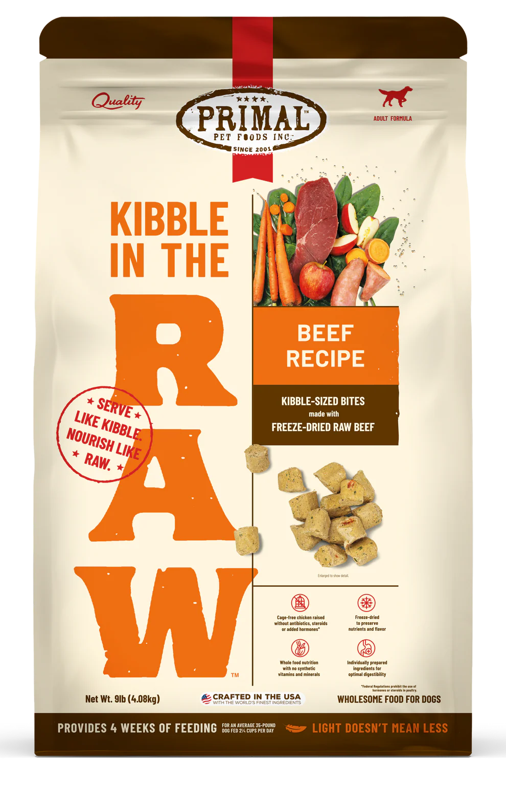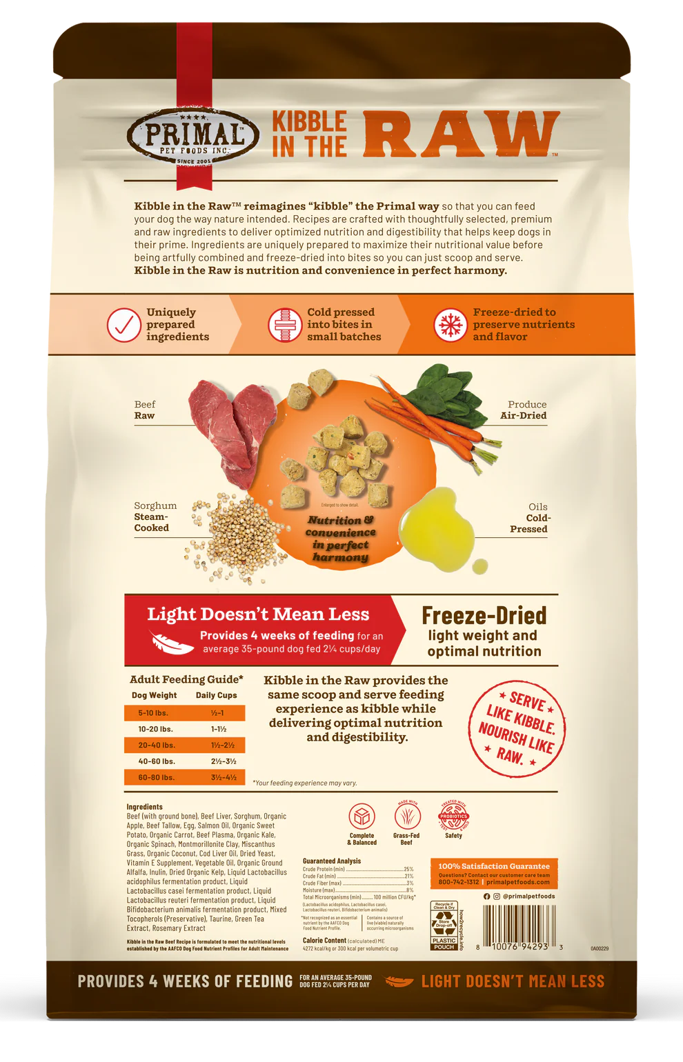 Kibble in the Raw reimagines “kibble” the Primal way so you can nourish your dog’s Primal needs. Our Beef Recipe is made with grass-fed beef and other thoughtfully selected, premium, and raw ingredients. Crafted entirely of freeze-dried bites, this recipe delivers optimized nutrition and digestibility in the same scoop-and-serve feeding experience as kibble. It's lighter and more dense than traditional kibble, so you get more feedings out of every pound of food.