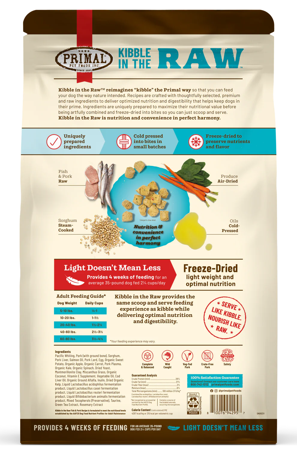 Kibble in the Raw reimagines “kibble” the Primal way so you can nourish your dog’s Primal needs. Our Fish & Pork Recipe is crafted with wild-caught fish and crate-free pork raised without antibiotics, steroids, or added hormones and other thoughtfully selected, premium, and raw ingredients. Composed entirely of freeze-dried bites, this recipe delivers optimized nutrition and digestibility in the same scoop-and-serve feeding experience as kibble. It's lighter and more dense than traditional kibble, so you get more feedings out of every pound of food.