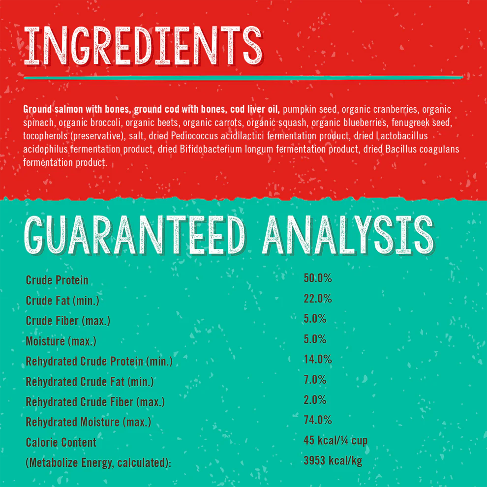 - - Irresistible Taste Dogs Love! Made of 95% fish, organs and bone, such as ground salmon and cod bones, our wild-caught Salmon and Cod recipe will delight your pup