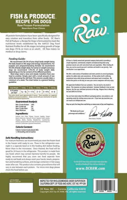 FROZEN FOOD (LOCAL DELIVERY, PICK UP, OR IN STORE ONLY) Net Weight: 6 lb. Top 3 Most Popular OC Raw Protein Slightly Higher Fat Content Adding More Quality Fat Content for Oilier Coat Complete & Balanced...Regular price $49.99 -