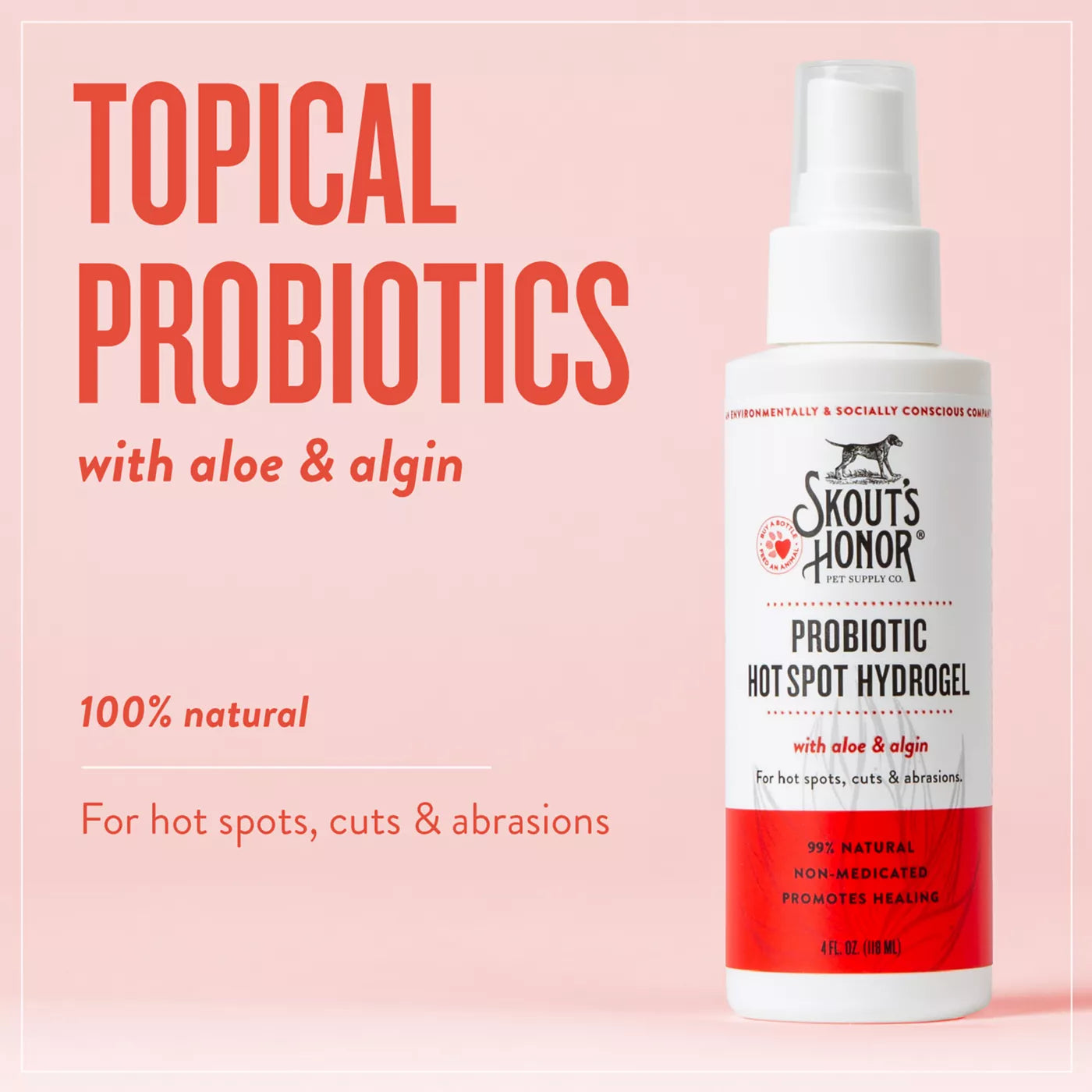 Skout's Honor Pet Supply Company Wellness Probiotic Hot Spot Hydrogel soothes, heals and protects wounds, including hot spots, abrasions, lacerations, burns and irritated skin. Skout's Honor Probiotic Hot Spot Hydrogel adheres to the affected area to moisturize and promote optimal healing conditions with the natural benefits of aloe vera, hickory bark extract, alginate and topical probiotics. Change what people expect from a pet product. Make each purchase one they are proud to make, from a brand they enjoy. Improve the quality of life for pets and their people.