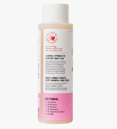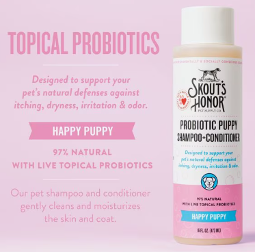 Make your pup a happy, clean camper with Skout’s Honor Happy Puppy Probiotic Cat & Dog Shampoo & Conditioner. This pet shampoo and conditioner gently cleans and moisturizes the skin and coat. It’s a great choice for both healthy pets and those who suffer from skin allergies. Made with avocado oil and topical probiotics to help support a healthy microbiome, it can help defend against common skin problems such as itching, odor, dryness, dandruff, hot spots, and excessive shedding. Your best friend will love getting a bath with this luxurious, plant-powered formula!