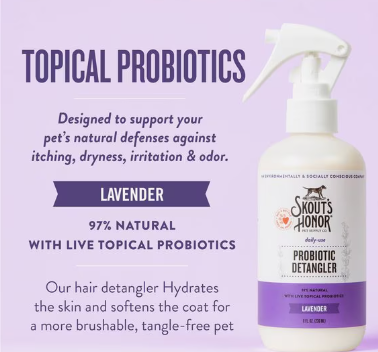 Say no to tangles and trouble during brushing with Skout’s Honor Probiotic Lavender Dog Detangler. This dog and cat hair detangler helps hydrate the skin and soften the coat for fewer tangles and an easier brushing experience. Made with avocado oil and topical probiotics to help support a healthy microbiome, it can help defend against common skin problems like itching, odor, dryness, dandruff, hot spots, and excessive shedding, too. With Skout’s Honor, grooming and brushing your furry friend just got a whole lot easier!