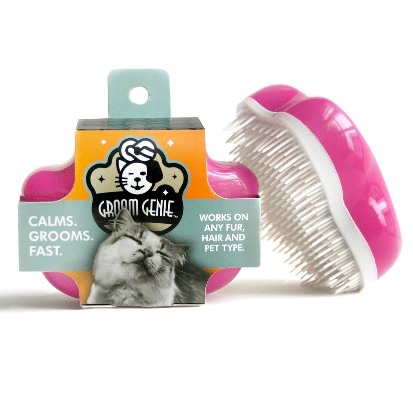 Pets and owners agree, petting a pet is more enjoyable than brushing a pet. However, the Groom Genie™ combines both. Its unique bristle design and pattern calms pets while it gently unravels knots in hair and fur. Each penetrating stroke of the Groom Genie helps to evenly pull natural oils through hair and fur for healthy skin and coat. Works its magic on any pet, wet or dry. Your pet will go from never wanting to be brushed to never wanting it to stop. Available in large Groom Genie size or 20% smaller Teeny Groom Genie.