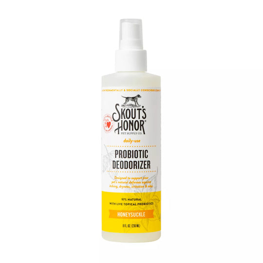 DESCRIPTION Skout's Honor Probiotic Honeysuckle Daily Use Deodorizer hydrates and deodorizes the skin and coat for a fresher, better-smelling pet in between washes. Hydrating, non-medicated, and for daily use, it contains avocado oil and topical probiotics...Regular price $12.99 -