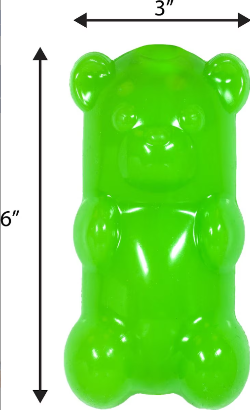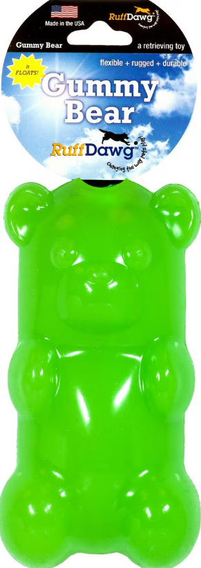 Ruff Dawg Gummy Bear retrieving toy is a cute bear-shaped toy that's treat-fillable. Weatherproof, washable, floats for water retrieval. High visibility Neon colors won't get lost in the grass or water. Gentle on teeth and gums. 100% Made safe in the USA of solid FDA-approved, recyclable rubber. Free of phthalates, latex, and BPAs.