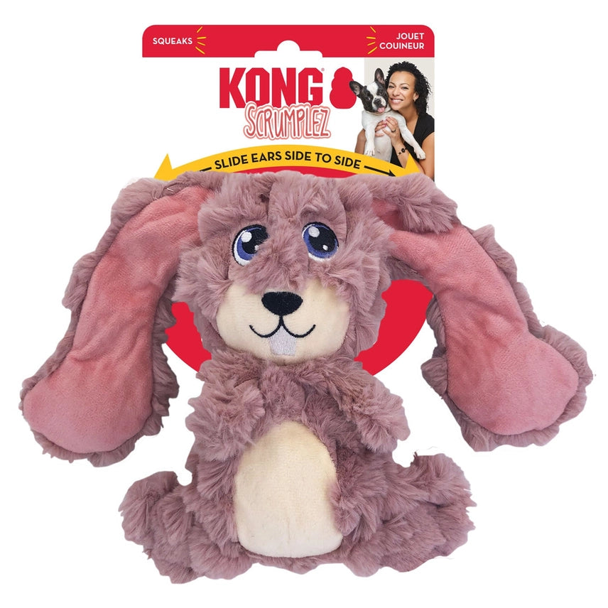 KONG Scrumplez critters delight dogs with ears that slide through their heads to add a surprising dimension to tugging fun. With irresistibly soft plush, these adorable buddies beg to be snuggled between instinct-satisfying bouts of gentle chewing, tugging and fetching. Squeaker prolongs play.