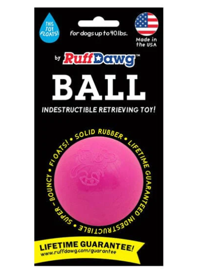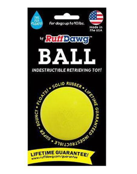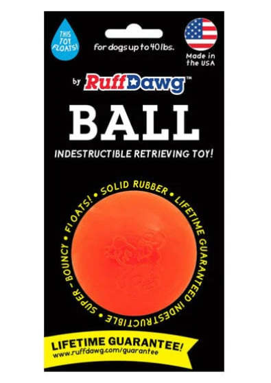 Ruff Dawg solid rubber Ball for retrieving is Guaranteed. Super-bouncing. 100% Made safe in the USA of solid FDA-approved, recyclable rubber. Free of phthalates, latex, and BPAs. Gentle on teeth and gums, weatherproof, washable, dishwasher-safe. Floats for water retrieval.