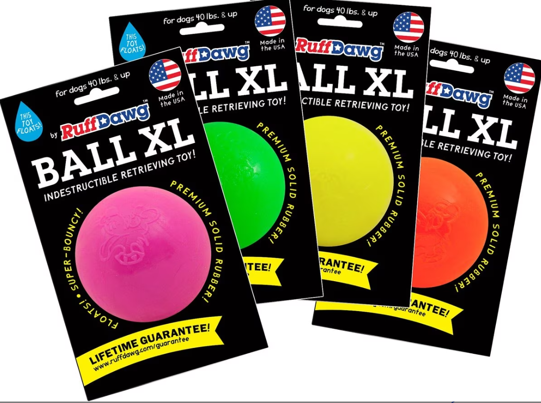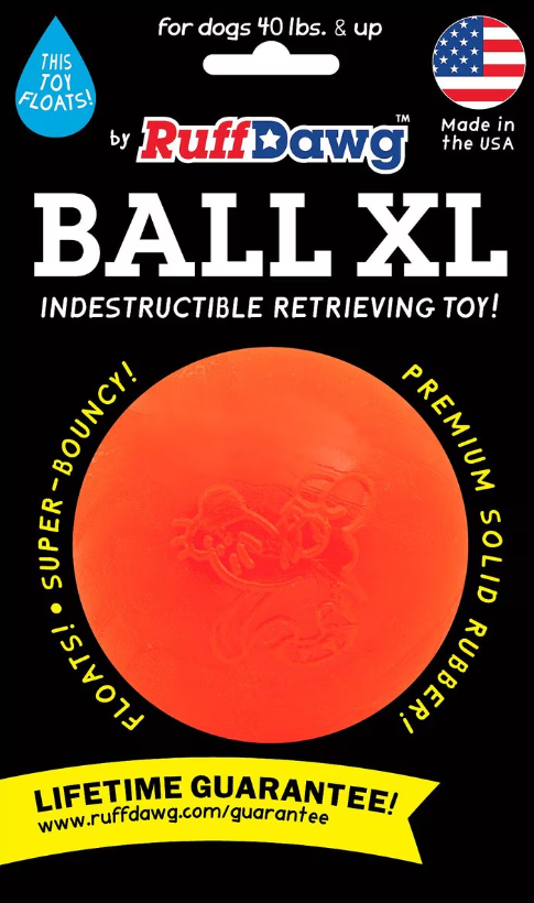 Ruff Dawg solid rubber Ball XL for retrieving is Guaranteed. Super-bouncing. 100% Made safe in the USA of solid FDA-approved, recyclable rubber. Free of phthalates, latex, and BPAs. Gentle on teeth and gums, weatherproof, washable, dishwasher-safe. Floats for water retrieval.