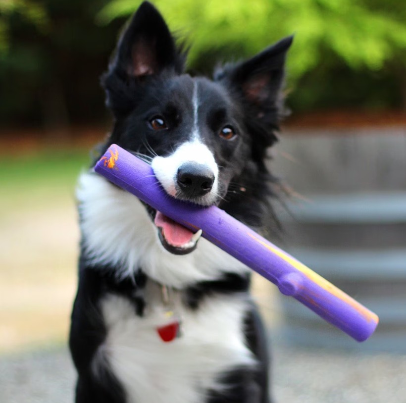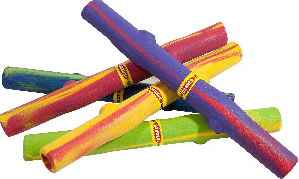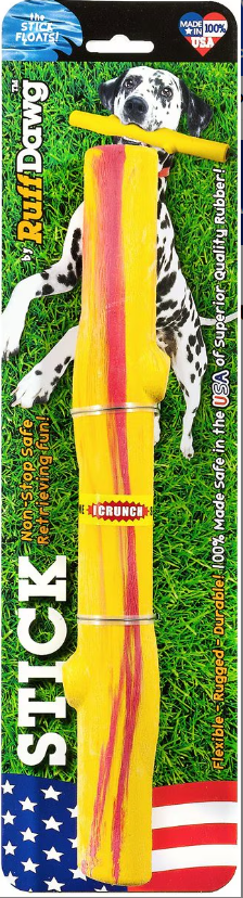 Ruff Dawg Stick Crunch is a noise-making, 12 inch rubber stick-shaped retrieving toy that makes crunchy sounds when dogs bite down - for crunchy fun without the splinters! Weatherproof, washable, floats for water retrieval. Bright marbled colors for easy spotting in grass or water. Gentle on teeth and gums. 100% Made safe in the USA of solid FDA-approved, recyclable natural rubber, with Mylar lining. Free of phthalates, latex, and BPAs.