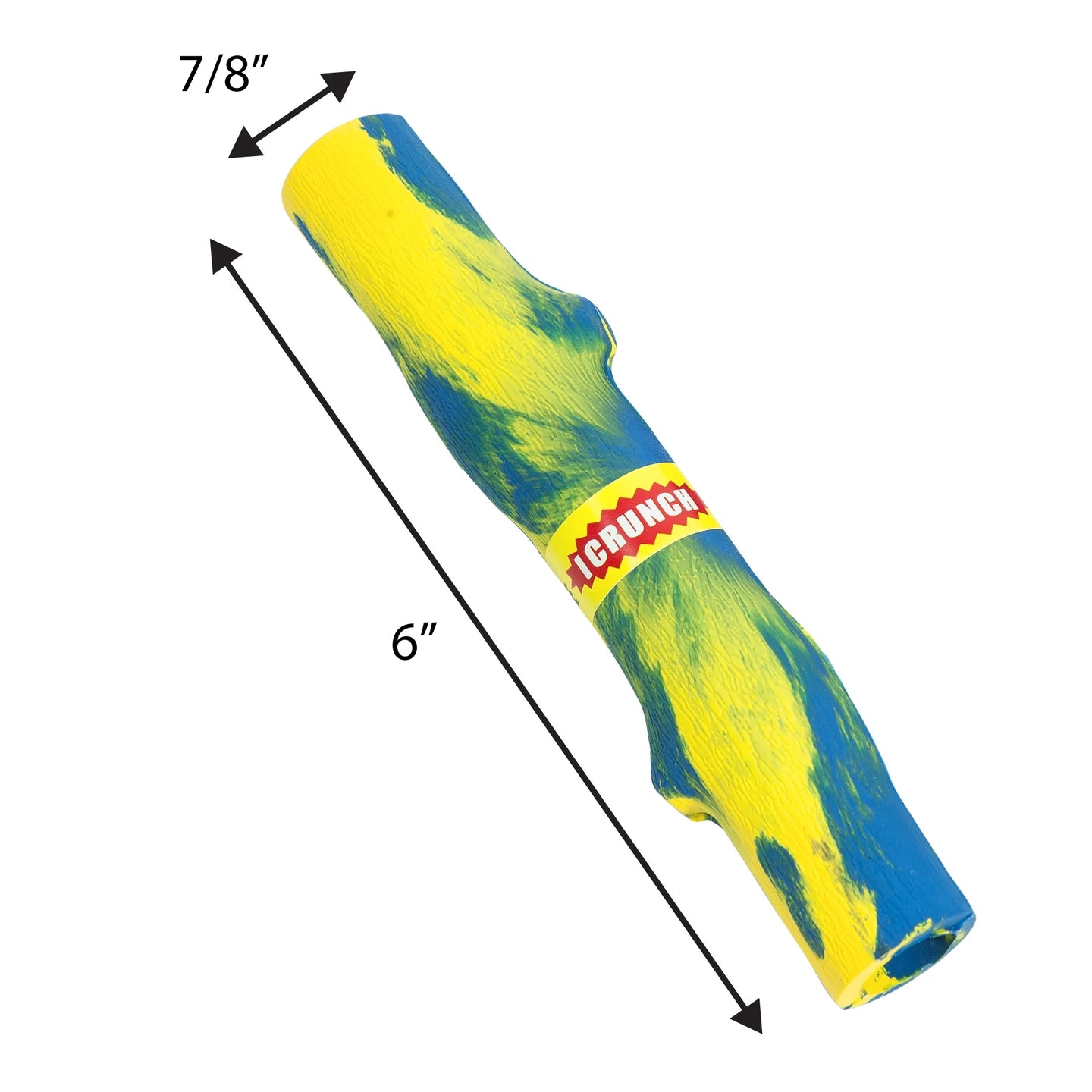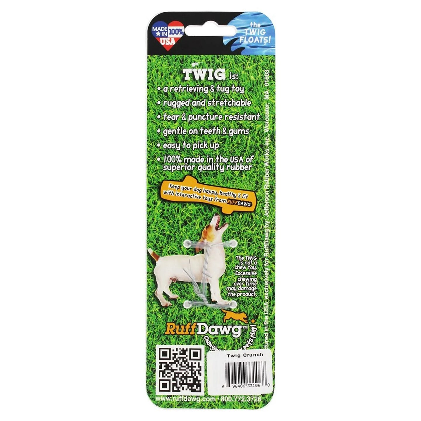 Ruff Dawg Twig Crunch is a 6 inch stick-shaped noise-making toy, that makes crunchy sounds when dogs bite down.- for crunchy, splinter-free fun! Weatherproof, washable, floats for water retrieval. Bright marbled colors for easy spotting in grass or water. Gentle on teeth and gums. 100% Made safe in the USA of solid FDA-approved, recyclable natural rubber, with Mylar liner. Free of phthalates, latex, and BPAs.