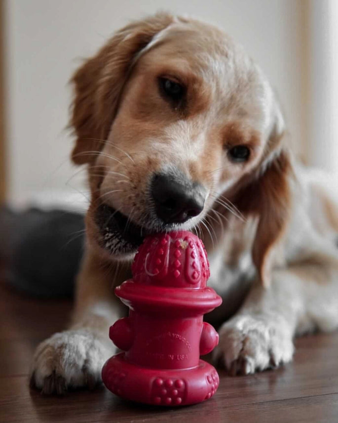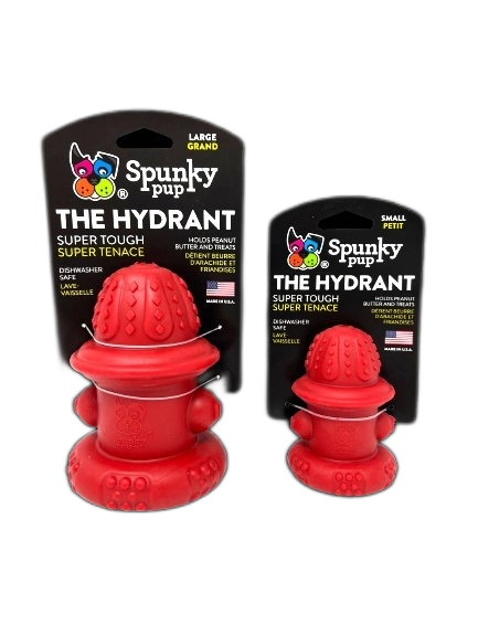 Spunky Pup's Rubber Hydrant features thick-walled Rubber construction. Made in the USA. The Hydrant is textured to promote healthy teeth and gums. Spread peanut butter inside or fill with your dog's favorite healthy treats. MADE IN THE USA! thick wall, heavy-duty, hole in the bottom that can be filled with your dogs favorite "lickable butter"!