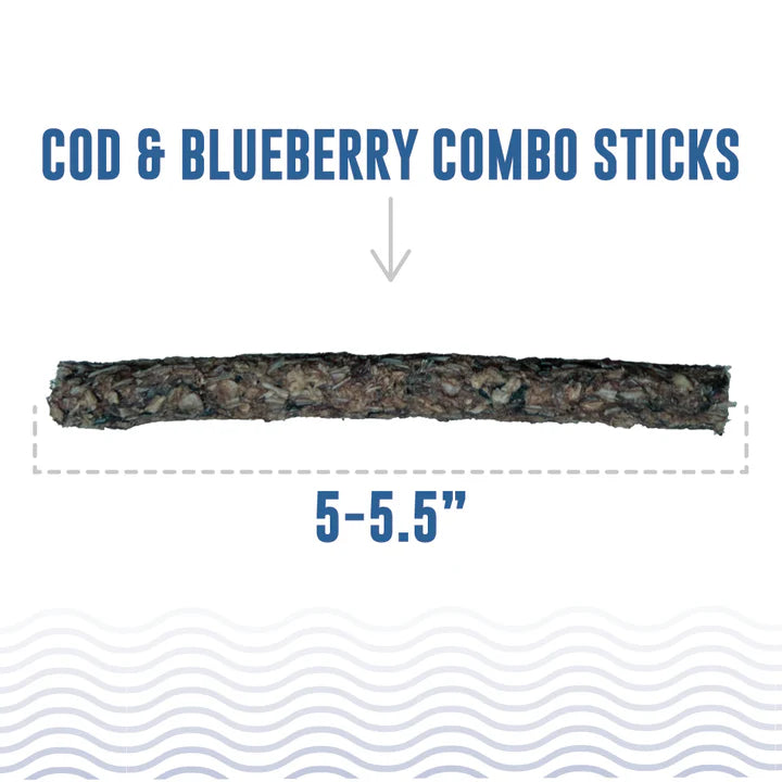 Your dog will love the irresistible taste, and satisfying crunch of our nutritious Cod & Blueberry Combo Stick dog treats, handcrafted with just two ingredients - responsibly sourced cod and wild blueberries – slow baked to perfection.  These crunchy sticks boast an irresistible taste and are packed with omega-3 fatty acids and high protein. Combo sticks are a healthy reward perfect for a pup with protein sensitivities. Our Combo Stick Fish Treats promote healthy skin and coat and help to reduce plaque and tartar build-up, making them good for your dog’s teeth.