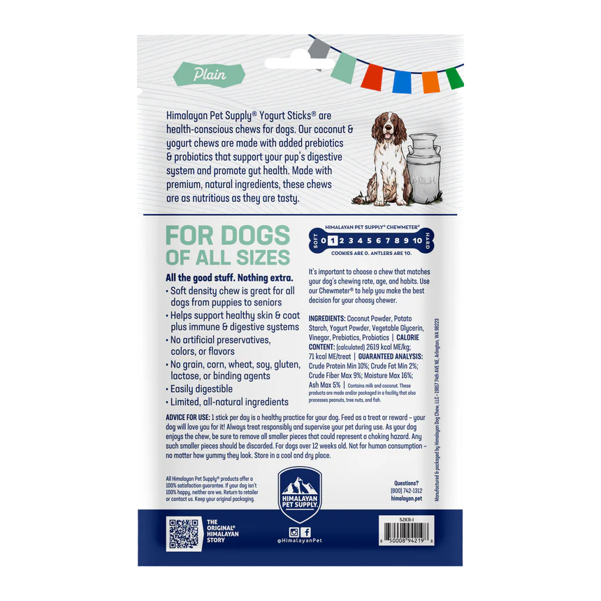 Yogurt Sticks® are a health and wellness treat for dogs. These health-conscious coconut & yogurt treats are loaded with Prebiotics and Probiotics that strengthen your pup’s gut health and support building a balanced digestive system. They are made with the finest natural ingredients, no artificial flavors or preservatives, and are lactose, grain, corn, soy, and gluten-free. These treats are as nutritious as they are tasty.