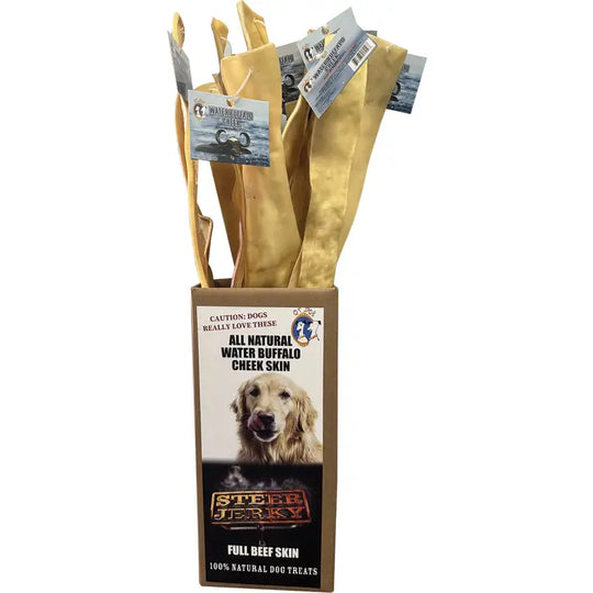 About this product Delicious oven dried Water Buffalo Head Skin strip, 1.5" wide and about 30" long. Great novelty item! Low to no odor. Comes with easy-to-display. Floor Display. Great alternative to traditional bleached rawhide! All...Regular price $15.50 -