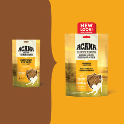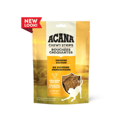 Delight your dog with the savory flavor of ACANA™ Chewy Strips! Crafted with 4 key ingredients, including delicious, protein-rich chicken and antioxidant-rich cranberries, you can feel good about treating your dog. Every strip also helps support your dog’s immune system, with Vitamin E and antioxidant-rich cranberries. Bone broth adds a burst of flavor, and sweet honey gives Chewy Strips a texture dogs love. It’s the perfect snack for moments you want to treat your dog while helping to support their wellbeing!