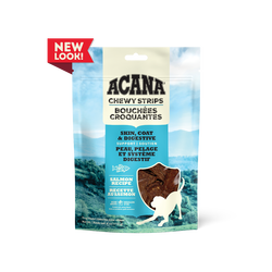 Delight your dog with the savory flavor of ACANA™ Chewy Strips! Crafted with 5 key ingredients, including delicious wild-caught salmon and fiber-rich pumpkin, you can feel good about giving your dog these ACANA dog treats. Every treat also helps support your dog’s skin and coat with Omega-3 fatty acids from wild-caught salmon, and digestive health from fiber-rich pumpkin. Bone broth adds a burst of flavor, and sweet honey gives these dog treats a texture they love. These high protein dog treats are the perfect snack for moments you want to treat your dog while helping to support their wellbeing!