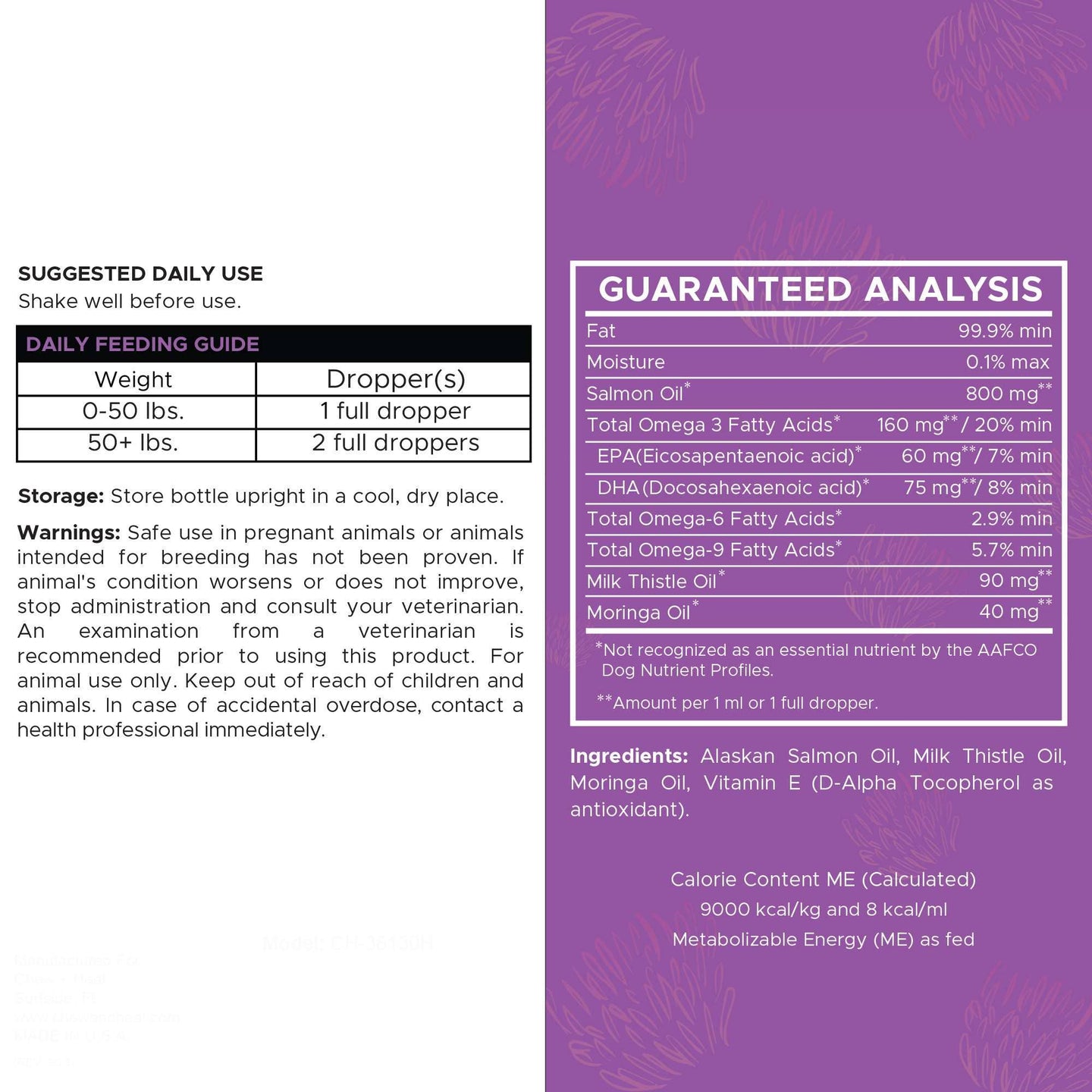 Milk thistle oil supports vital organs like the liver and kidneys, moringa oil supports immune and brain function, and wild Alaskan salmon oil supports skin and coat health.