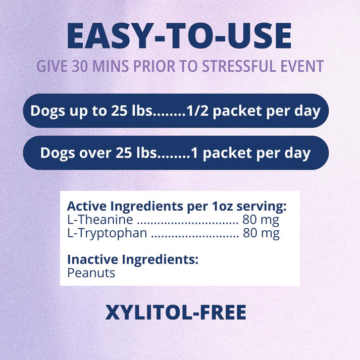 Vet-Formulated - These 1oz packets are formulated with two all-natural calming ingredients, L-tryptophan and L-theanine, perfectly dosed for your pup. Made in the USA using only the world's best ingredients.