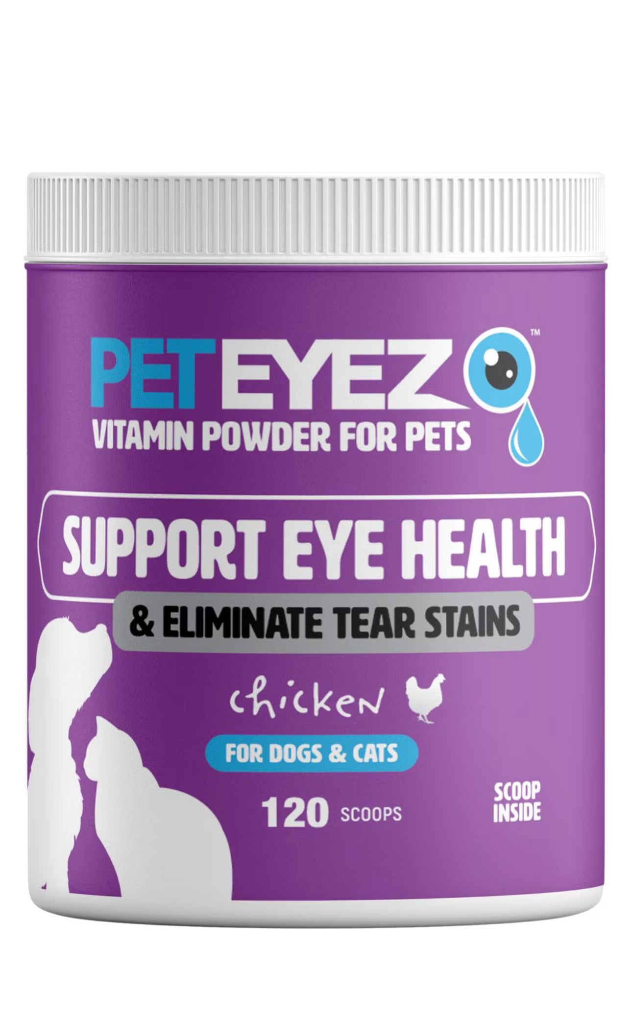 Keep your furry friend’s eyes clear and sharp with the Pet Eyez Chicken Vision & Tear Stain Powder Supplement for Dogs & Cats. This freeze-dried supplement is specially designed to support your pet’s eye health. Developed by optometrists and veterinary specialists, it contains the perfect blend of natural ingredients for optimal retinal and lens support. This supplement is formulated with all-natural protein, antioxidants, and essential vitamins and minerals, plus it’s 100% natural, grain-free, and free of antibiotics. Say goodbye to unsightly tear stains and hello to healthy eyes with this easy to use pet eye supplement.