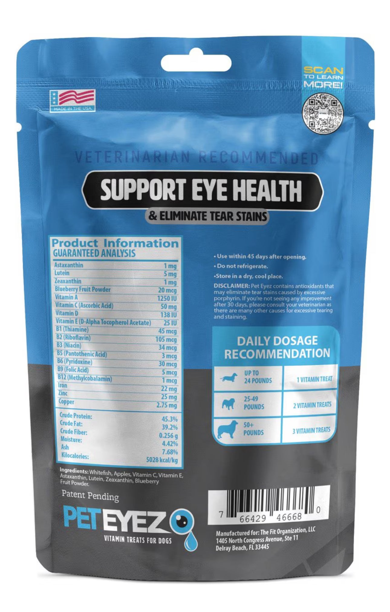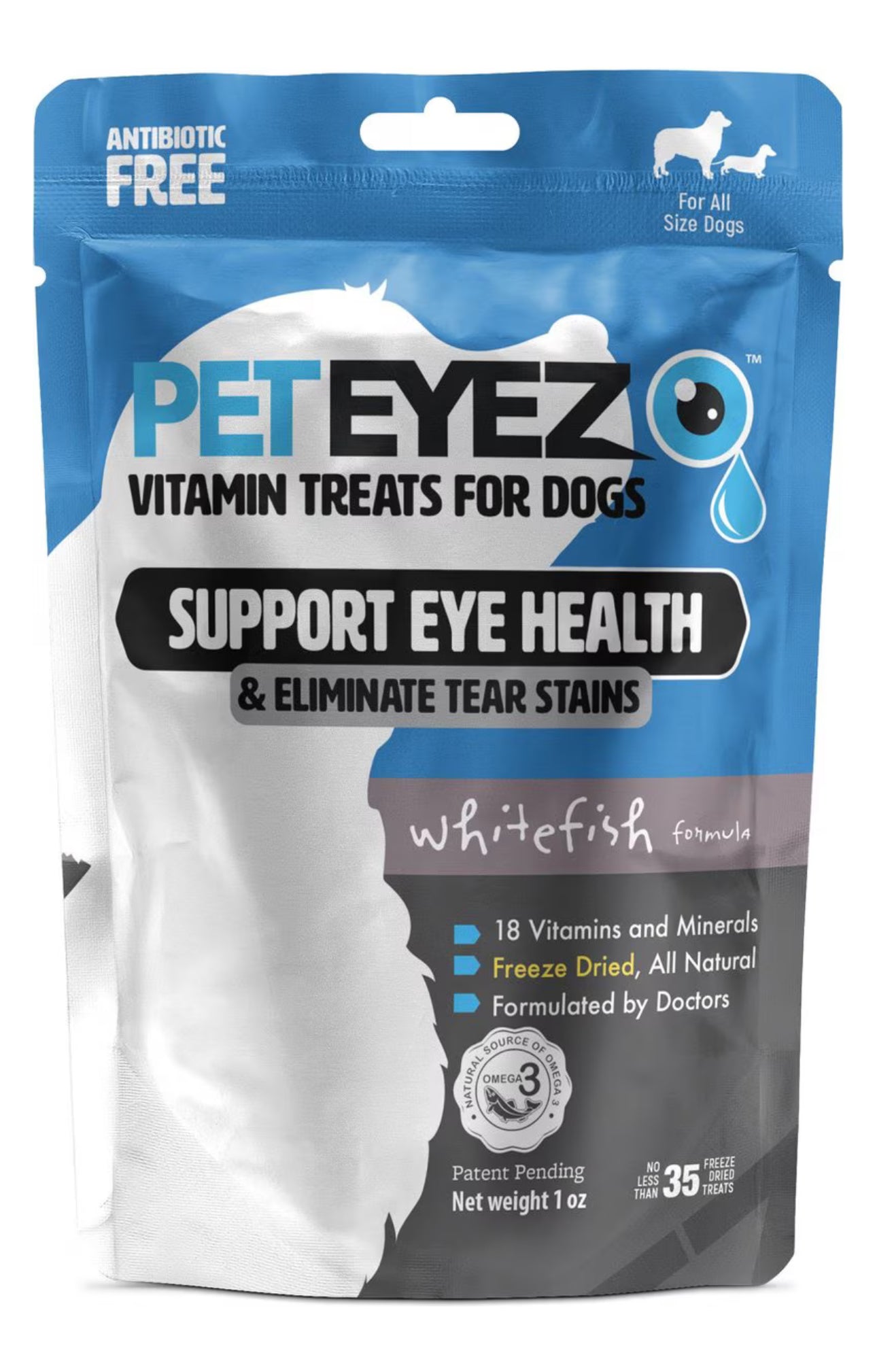 Help your buddy keep his eyes clear and sharp with the Pet Eyez Whitefish Freeze-Dried Vision & Tear Stain Supplement for Dogs. This freeze-dried supplement is specially designed to support your furry friend's eye health. Developed by optometrists and veterinary specialists, it contains the perfect blend of natural ingredients to provide optimal retinal and lens support in dogs. Formulated with all-natural protein, antioxidants, and 18 essential vitamins and minerals, this supplement is 100% natural, grain-free, and free of antibiotics. Say goodbye to messy tear stains and help keep your pup’s peepers in top shape with this easy to give eye supplement.