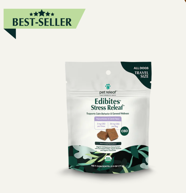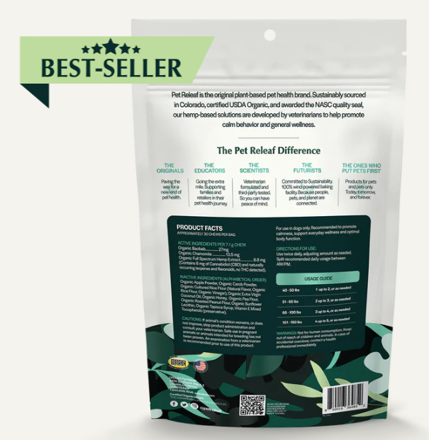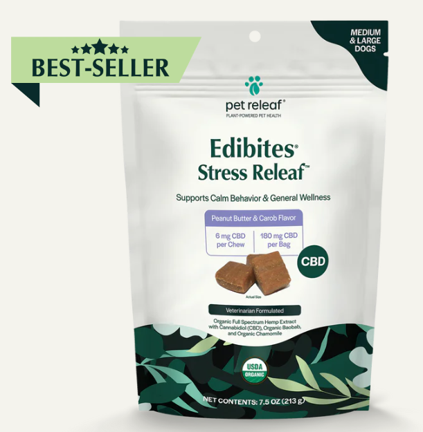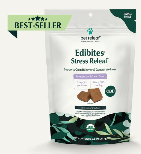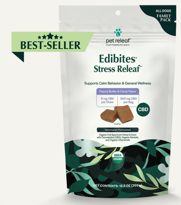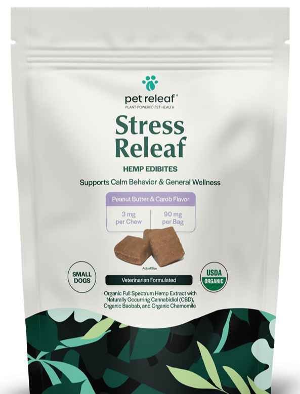 Help your furry friend stay calm and collected with support from Pet Releaf Edibites Stress Releaf Organic Peanut Butter & Carob Flavored Chew CBD Calming Health Supplement for Dogs. These tasty peanut butter and carob-flavored CBD calming chews are perfect for support for stress management to assist with unexpected, challenging events like loud gatherings, fireworks, doorbell sounds, and separation. Proactive pet parents will love these convenient and delicious chews as they give them a great way to support their pup and help him maintain composure anytime, anywhere.