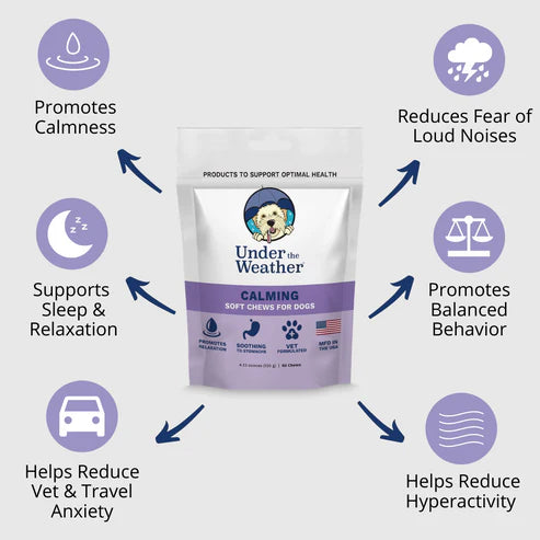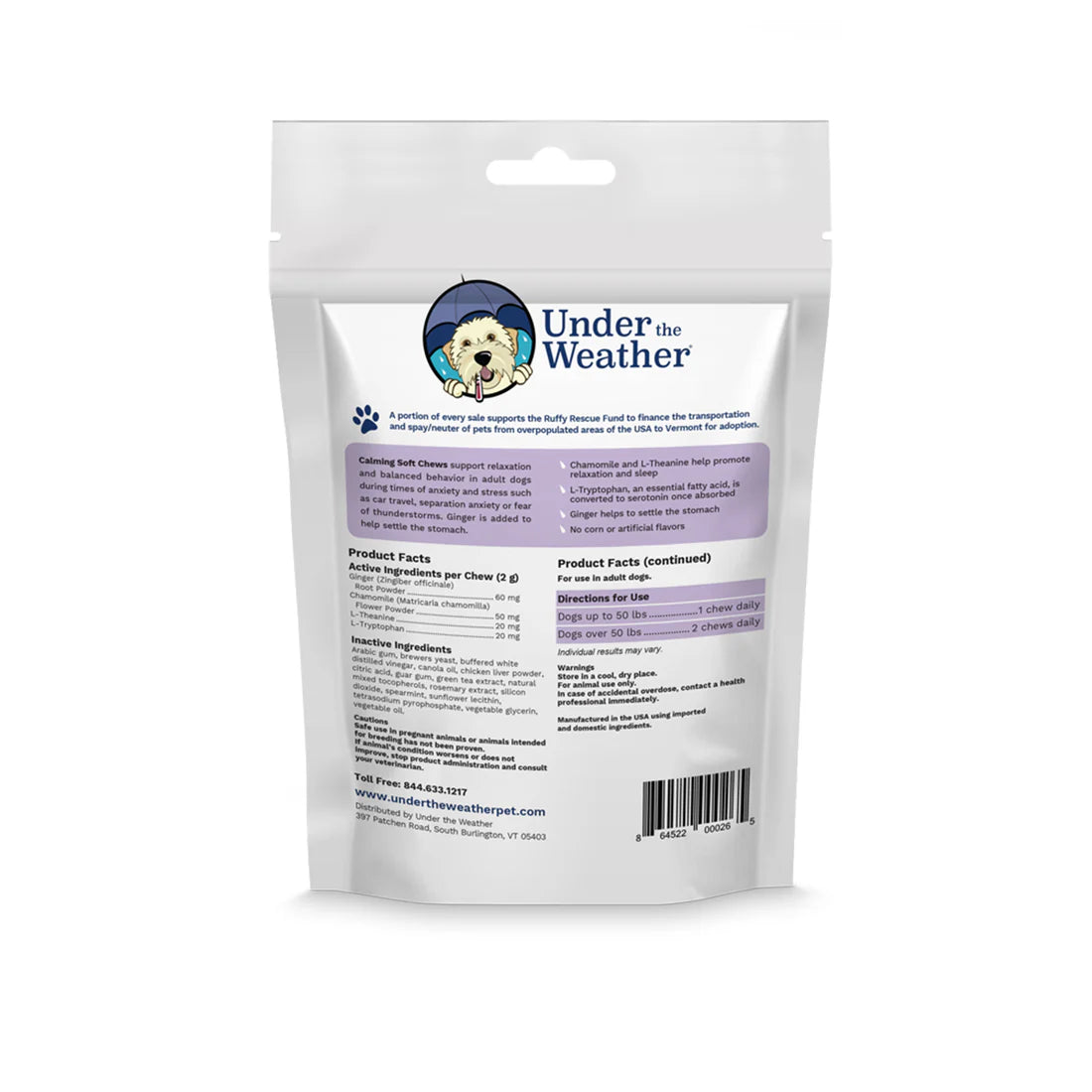 Reduce stress and help keep your dog feeling calm and relaxed with Under the Weather Calming Soft Chews for Dogs! These dog supplements contain ginger to help ease a nervous tummy, chamomile and L-theanine to encourage sleep and relaxation, and L-tryptophan, an amino acid that boosts serotonin for a balanced mood.