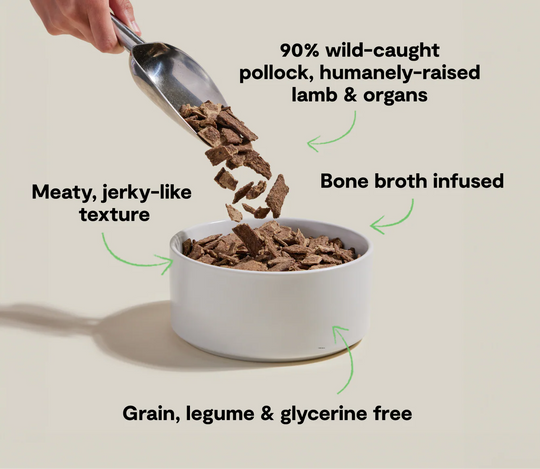 This meaty, jerky-like recipe is gently air-dried at low temperatures to naturally preserve nutrition and mouth-watering taste. Crafted with 90% Ocean Wise recommended wild-caught pollock and animal welfare certified lamb & lamb organs, this recipe is...Regular price $27.99 -