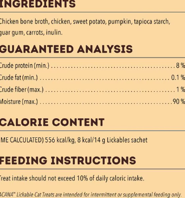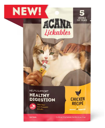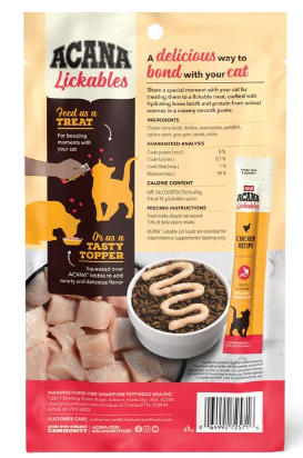 Share a special moment with your cat by treating them to delicious ACANA Lickables! Crafted with protein-rich animal ingredients and hydrating bone broth, Lickables treats will tempt your cat to come closer and purr with enjoyment as they bond with you and experience a burst of flavor. These treats are the perfect texture for hand feeding - simply knead, tear and squeeze the pouch to feed your cat a delicious puree, without any mess. Our Chicken Recipe also helps support healthy digestion, giving your cat benefits in every pouch. Your cat will love this creamy, smooth puree, and you'll love getting closer to your favorite furry friend!
