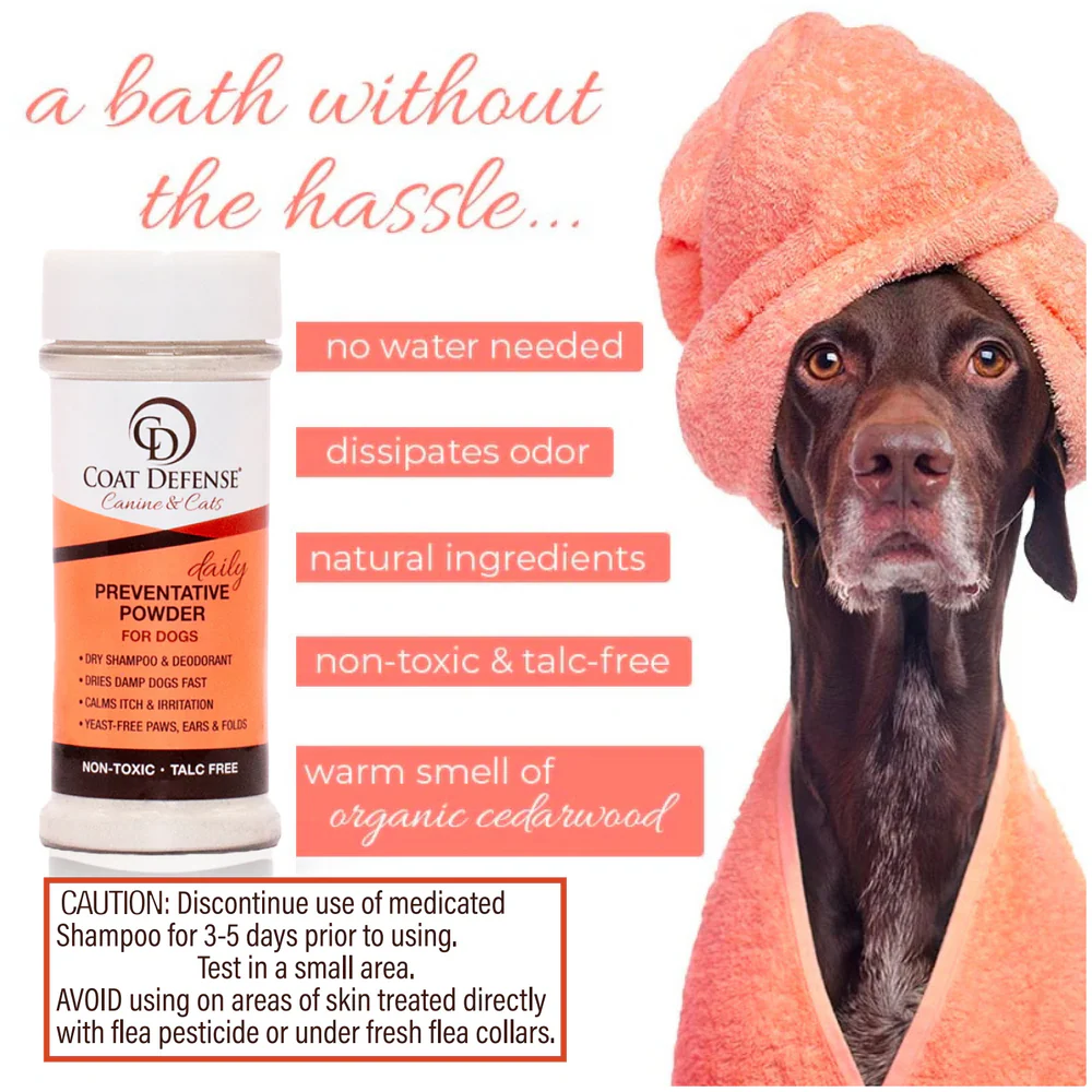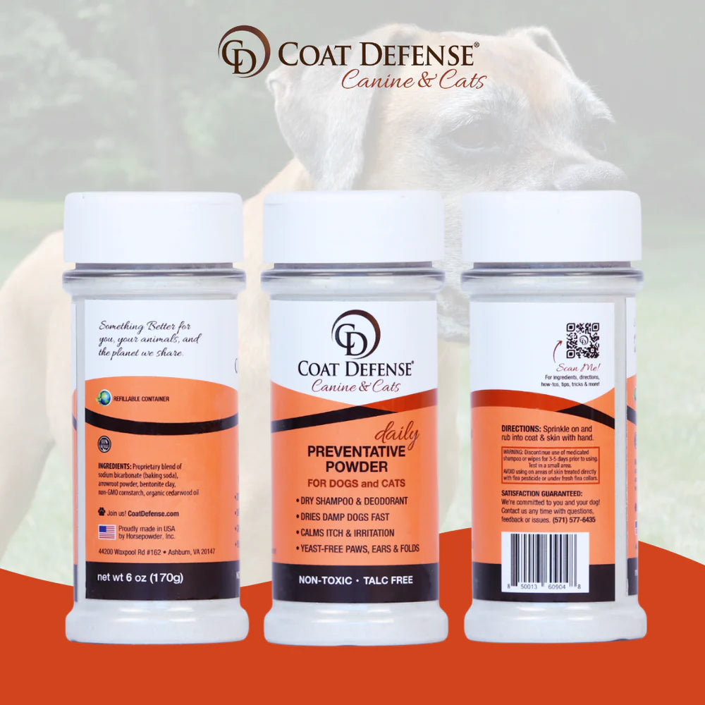 COAT DEFENSE® Canine & Cats daily PREVENTATIVE POWDER: A non-toxic remedy for yeast overgrowth, itch, stink, skin inflammation, "elephant skin" and hair loss that may accompany. Great to freshen your best friend up between baths and dissipate odor!
