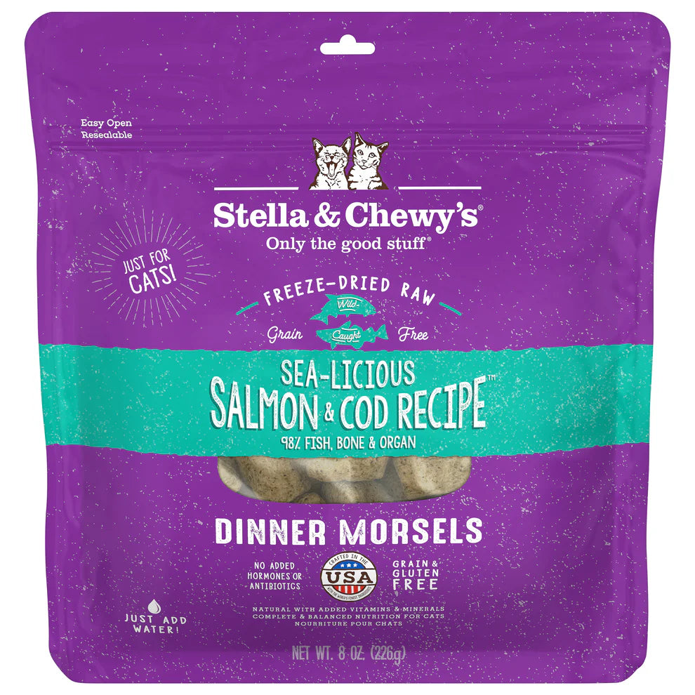 These Stella & Chewy's Cat Freeze-dried morsels (Sea-Licious Salmon & Cod offering) deliver the most convenient way to feed your cat a raw diet. The most pure, pristine, grain free and economical raw nutrition available! Give your cat what they naturally crave with Stella & Chewy's freeze-dried raw morsels.